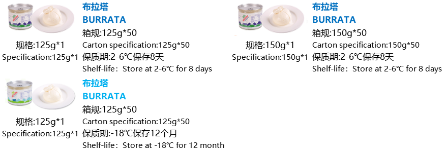 BURRATA cheese originated in southeastern Italy and is a fresh Italian cheese made by mixing fresh mozzarella cheese and cream.The outer layer is a solid mozzarella cheese,while the inside is wrapped in a creamy curdled mass and fresh cream.It contains rich protein and calcium and can be eaten alone or seasoned with salt,pepper and extra-virgin olive oil.It is very suitable for serving with fresh tomatoes and Italian cured meats to make a salad or delicious as a side dish on pizza or bruschetta.